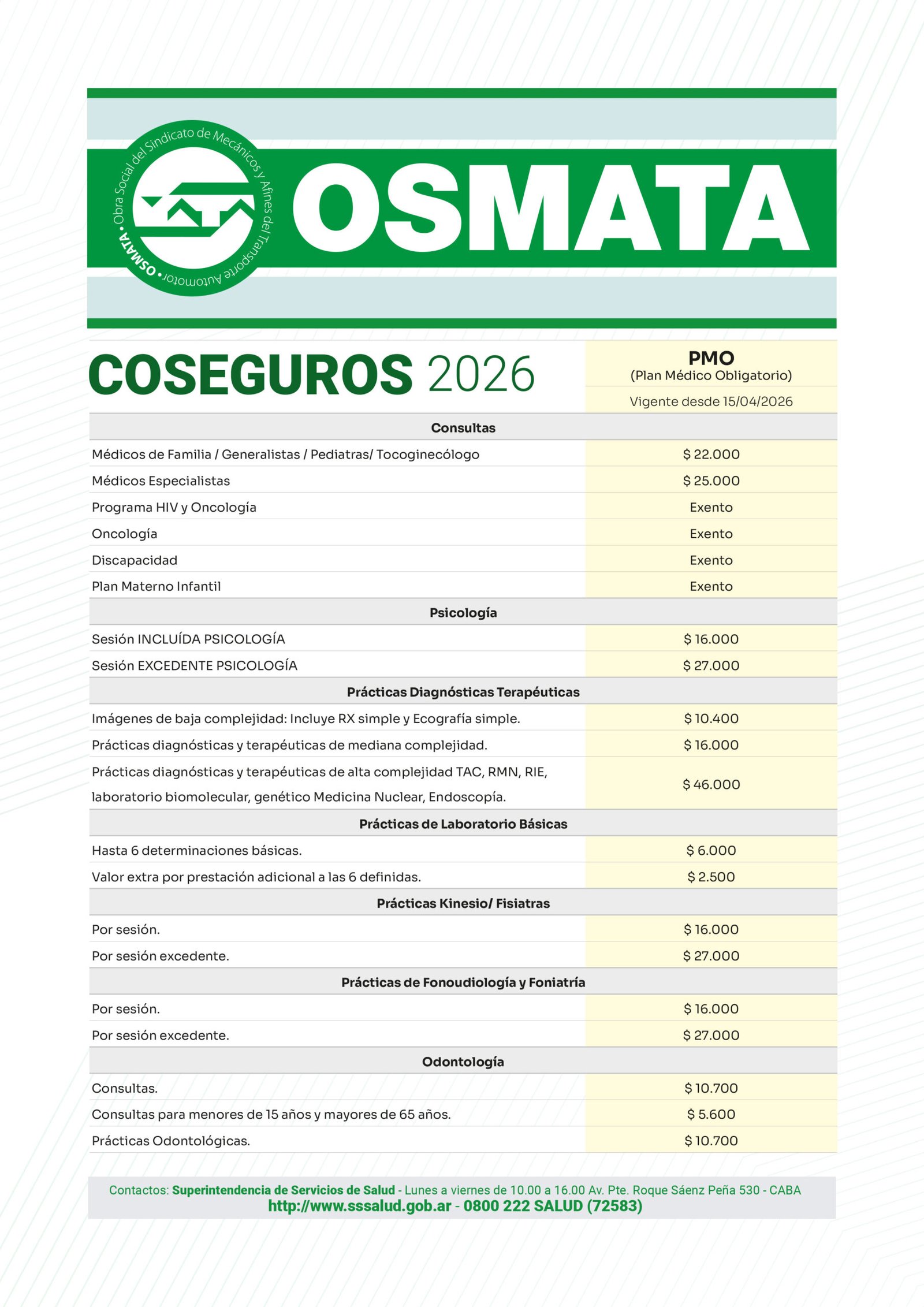 A partir del 15 de ABRIL de 2026, OSMATA introduce nuevos valores de coseguros para la atención bajo el Plan Médico Obligatorio (PMO). Consulta los detalles sobre: consultas, prácticas ambulatorias y atención domiciliaria, con tarifas actualizadas para médicos, especialistas, estudios de diagnóstico, psicología y más. Ajustado a tus necesidades, para una atención de calidad y eficiente.